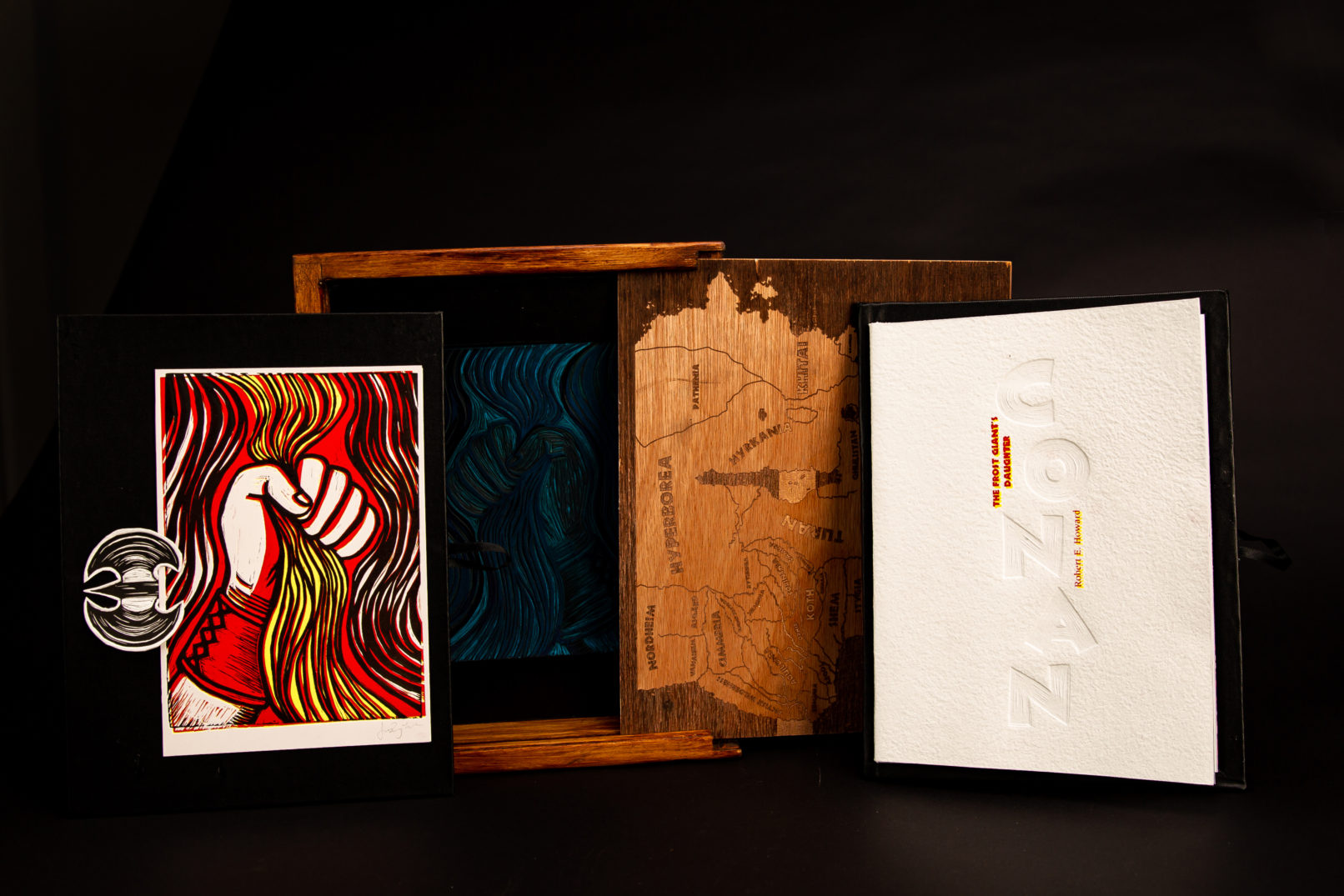 This was a group collaboration project designed by Ju Ping Yeh alongside Luke Tulip and Ho Ming Li. The linocut illustrations designed by Ju Ping Yeh and Ashely Chen. The aim for this project was to design a limited edition book for The Frost Giant’s Daughter by Robert E. Howard.