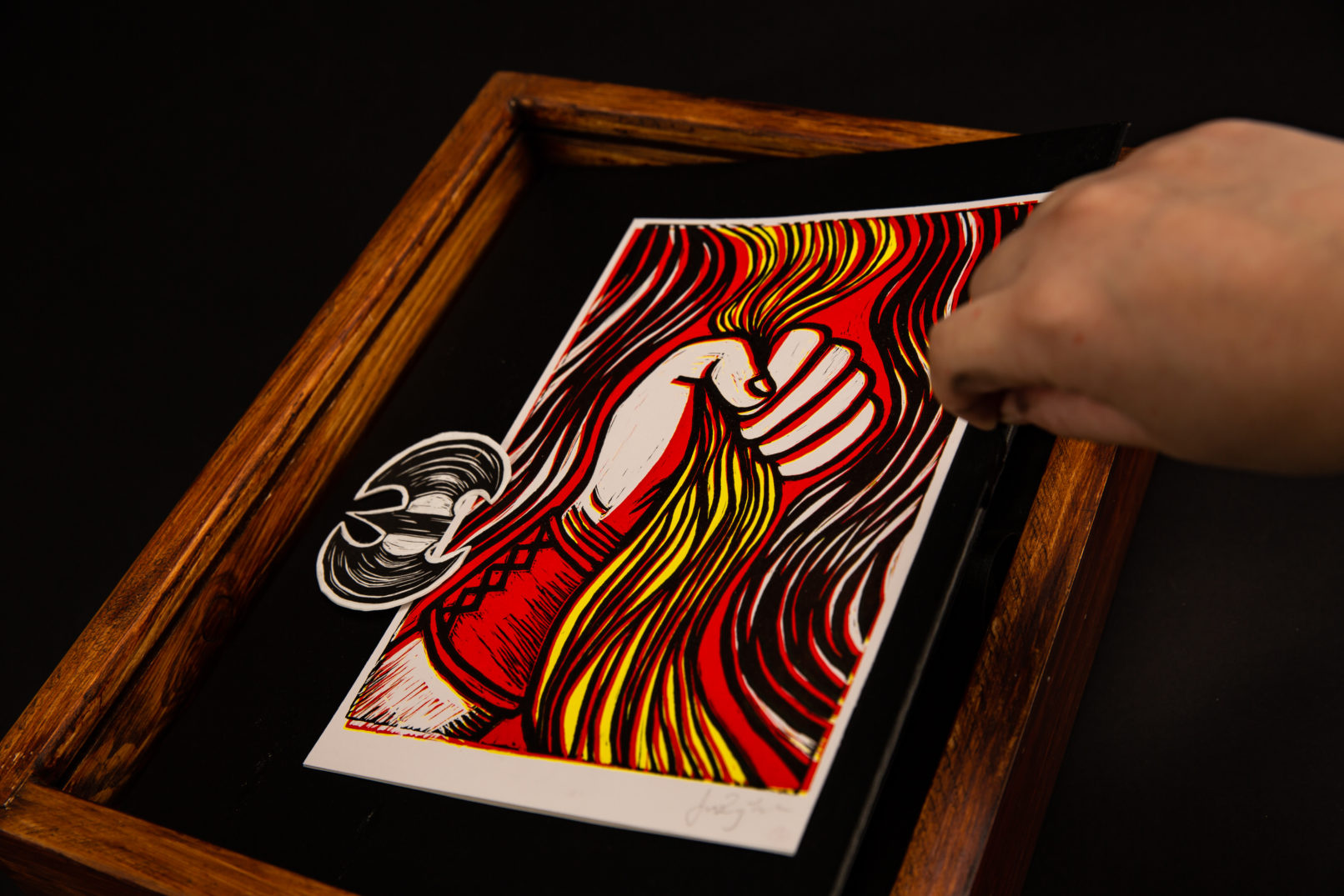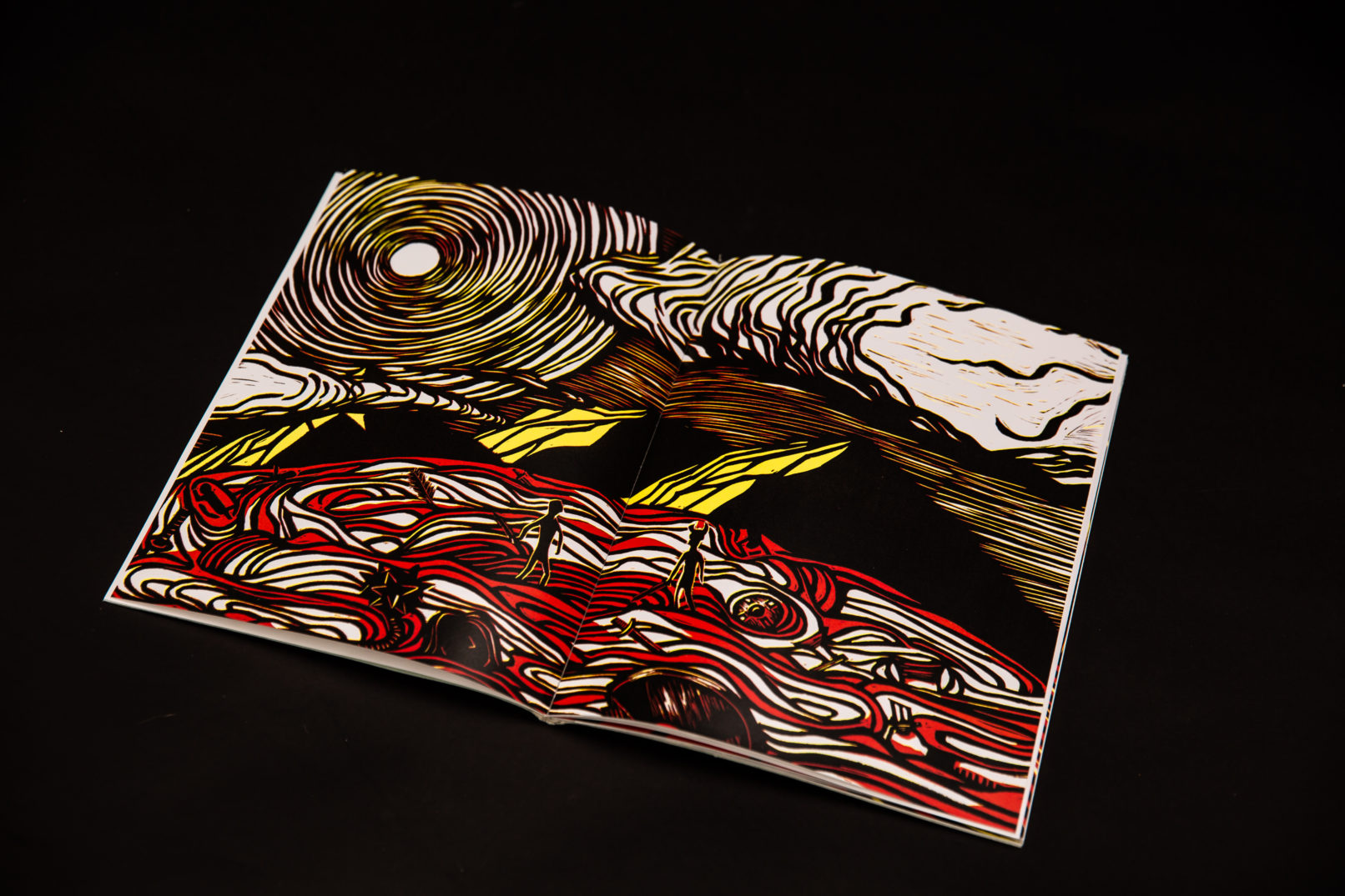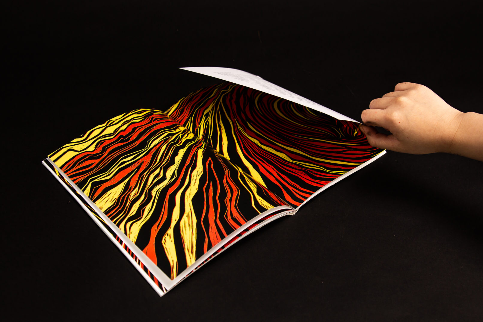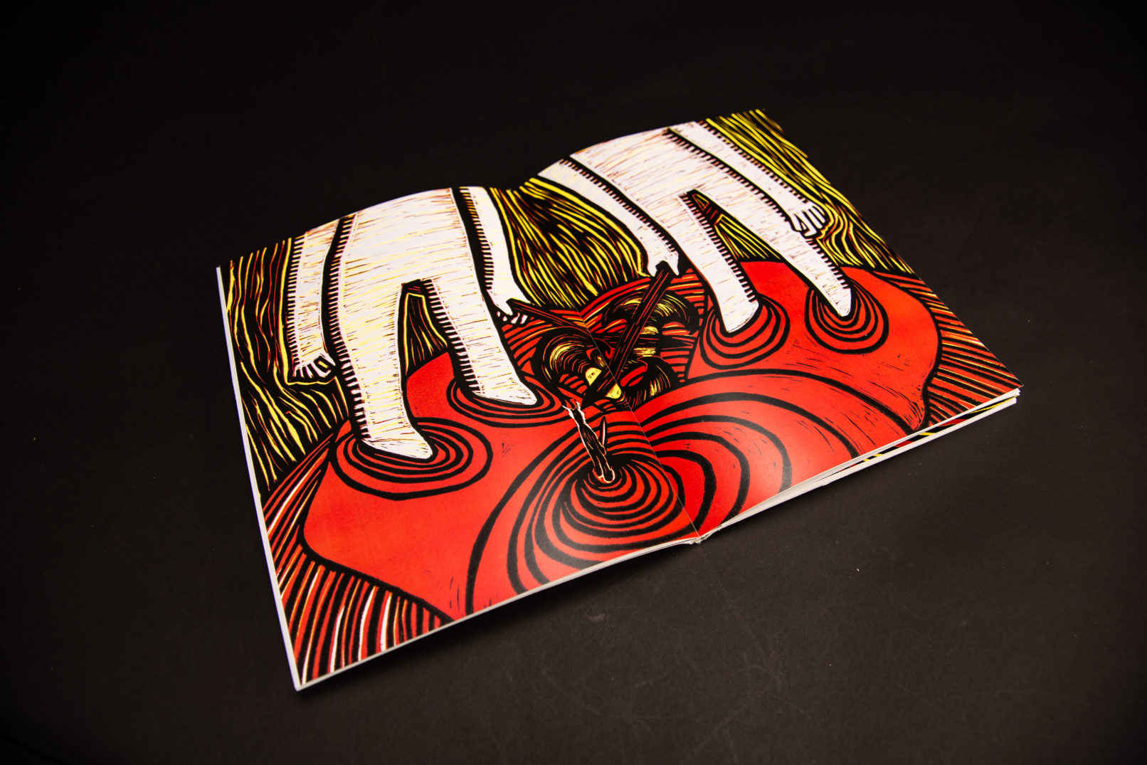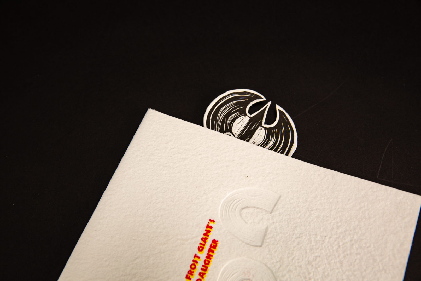 The design is clear and minimal as we’ve carefully selected the size of the images and text appropriately so that they both work in harmony. The cover is hand-made by Ju Ping Yeh to imitate the effects of snow to set the scene of the book’s location. Different editions will continue to be made by hand and will have a different paper texture. The type of binding we have used is perfect bound by hand instead of saddle stitch to allow the gate folds due to the longer paper. This method of binding provides a better finish and allows the user to see the best view of the double page illustrations as the pages open flat. The linocut illustrations designed by Ju Ping Yeh and Ashely Chen were used to reference the 3 colours mention in the book (black, red and yellow). The illustrations appeared regularly to complement the narrative text throughout the book. The colour used in this publication is black, red alongside yellow to represent the Conan’s black hair and the red of Vanaheim and the yellow of Cimmeria. The typeface used in the book is Meridien and Neuland. The body text is a serif typeface name Meridien designed Adrian Frutiger. We decided to use a serif typeface to keep it traditional as it’s used in books and Meridien provides clarity for ease of reading. Neuland is used for the title ‘The Frost Giant’s Daughter’ as we felt that we wanted something bold and blocky. The half title typeface is a linocut print based on the Neuland title typeface.